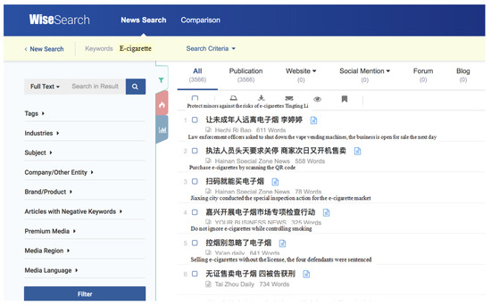 In order to gain insights about health communication through Chinese media platforms, we collected Chinese e-cigarettes news from 1 November 2015 to 31 October 2020. We chose the keyword “e-cigarettes” and searched the Huike (WiseSearch) database, one of the most professional leading Chinese media databases founded in 1998. This database collected over 96 million news items daily, over 1600 print media, and 50,000 internet media offer news to this database [29].