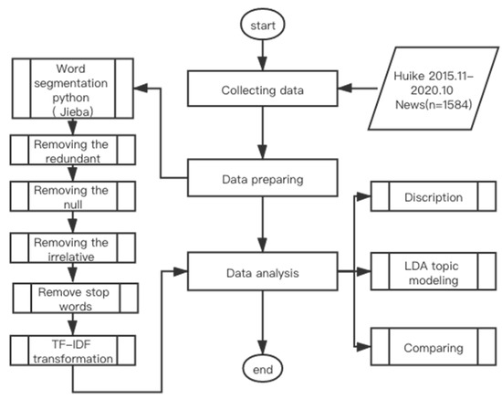 A total of 1584 e-cigarettes news were collected from Huike. We cleaned and prepared the data for LDA topic modeling as illustrated in Figure 2 with Python 3.0. We use the Jieba package in python (a Python package used for Chinese language processing) to separate words, as Chinese words are connected [36,37]. We also removed the null and repeated information to conduct further study. Common Chinese stop words with less information such as “a,” “the,” or “very,” were excluded to generate meaningful result. Then, we applied the term frequency-inverse document frequency (TF-IDF) process to the data to weight the significance of a word in one specific article [38].