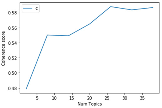Choosing a proper topic number as a parameter for further analysis is significant for the LDA topic modeling approach in order to avoid having too many or too few topic numbers that are either difficult to interpret or unable to distinguish one another. Our study looked for the optimum number of topics for LDA by calculating the coherence score [39]. This measure compares the degree of semantic similarity for different topics by calculating every two context vectors’ average of cosine values [40]. We use Gensim (a Python package) to calculate a coherence value and find an optimal number of 26, as shown in Figure 3 [41]. Therefore, we chose 26 as the proper parameter for the topic number and set λ = 1 to conduct the analysis with LDAvis tool in Python. Each topic was named according to the top keywords, respectively, as shown in Table 1. We also concluded with four major themes to further analyze the major emphasis of health communication.