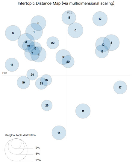 To better understand the relationship between different topics, we visualize the 26 topics in Figure 4. This figure shows 26 circles that represent respective topics. We can obtain the overall prevalence by computing areas of all of the circles compared with the reference area below (the area is the prevalence). Their prevalence can also be seen from the statistical results on the right side of Table 1. Intertropical distances are represented by multidimensional scaling on a 2D plane [42]. Figure 4 answers two important research questions: (1) what is the meaning of each topic? (2) how prevalent is each topic? In the Figure 4, the circles 1, 2, 3, and 4 are relatively large, indicating that this topic accounts for a large proportion of all of the topics. There is overlap between circles 1 and 2 in the Figure 4, indicating that there is a relationship between the two topics. The interaction between different themes illustrates the correlation between the popular topics. The principal components PC1 and PC2 represent the transverse axis and longitudinal axis, respectively [43].