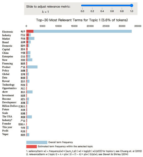 To further discuss each topic, we displayed the top 30 keywords as relevant terms, shown in Figure 5. For topic 1, they are mainly about Electronic, Industry, Market, and others. They had the highest proportion in their period; therefore, we present them as examples for demonstration. The overall term frequency and estimated frequency of term Electronic are highest and followed by Industry and Market. The word frequency distribution was relative to the entire corpus by the system. The blue bar presents the overall term frequency, and the red bar presents the estimated frequency of a specific topic. In topic 1, Chinese mass media preferred to talk about what treatment the patients can receive at the end of life. By this approach, illustrated in previous literature, we could interpret topics’ content [44].