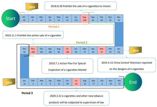 Table 2 shows Chinese regulations concerning e-cigarettes recent years. Figure 6 indicates the time and the quantity of news coverage from 2018 to 2020. Prior to the emergence of relevant policies, the level of news coverage on e-cigarettes has been sluggish. The number of news articles peaks and wanes, affected by time and related regulations and inspections, as shown in Figure 6, mainly including local and national regulations. In the month that the regulation was released, the number of news articles on e-cigarettes rose to a high level.