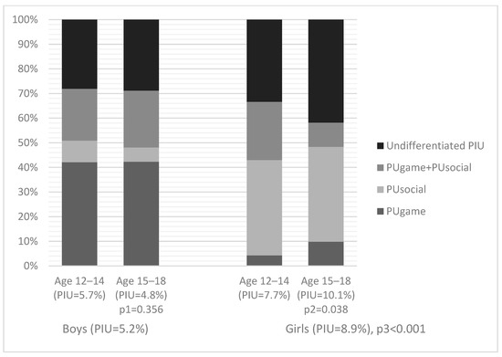 In our opinion, the data on PIU structure age dynamics, presented in Figure 1, seem to be quite interesting. As for the boys, we recorded a fairly stable structure not changing within the age interval of 12–18. At the same time, the share of PIU not differentiated in this research (non-PUgame and non-PUsocial PIU) increased in the girls significantly with age. At present, we cannot judge definitely on the older girls’ change of interests—into which area of Internet activity they are shifting. These can represent online chatting, consumption of audio and video content available exclusively on the Internet, online shopping, permanent news searches in fear of missing out, compulsive absent-minded Internet surfing, the use of the Internet for educational purposes, or a combination of the above. This unresolved issue should be a subject of further research.