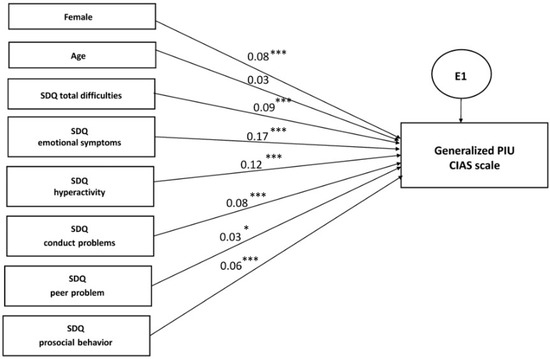 Multiple regression model for generalized problematic Internet use (PIUgen), n = 4514. Note: standardized regression weights are shown. Variables were coded as: boys—1, girls—2; age 2–14—1, age 15–18—2; model fit parameters: CFI = 0.993, TLI = 0.962, RMSEA = 0.036, p < 0.001. *: p < 0.05; **: p < 0.01; ***: p < 0.001.