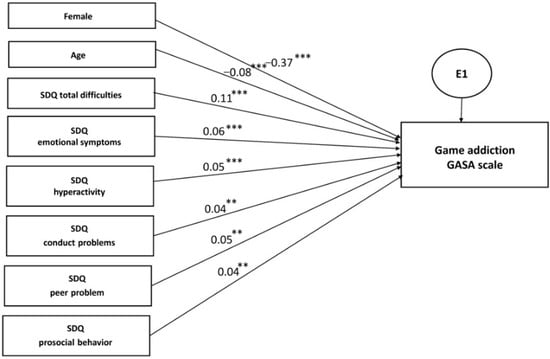 Multiple regression model for problematic video game use (PUgame), n = 4514. Note: standardized regression weights are shown. Variables were coded as: boys—1, girls—2; age 2–14—1, age 15–18—2; model fit parameters: CFI = 0.993, TLI = 0.964, RMSEA = 0.036, p < 0.001. *: p < 0.05; **: p < 0.01; ***: p < 0.001.