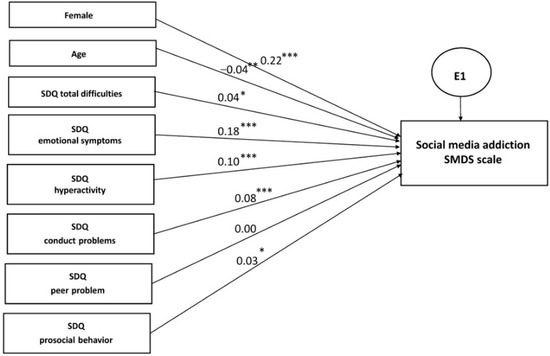In order to compare the link of PIUgen, PUgame, and PUsocial with the relevant predictor variables, including the demographic and psychosocial characteristics based on the SDQ, we undertook a separate multiple regression analysis within structural equation modelling (Figure 2, Figure 3 and Figure 4; Table 9, Table 10 and Table 11). The results demonstrated evident and distinct associations of certain predictor variables with the explored outcome variables. Thus, the male gender representatives showed a very high association with PUgame (β = −0.37, p < 0.001), whereas the female gender representatives demonstrated associations with PUsocial, although to a lesser extent (β = 0.22, p < 0.001). The age, city of residence, and nationality of the adolescents showed a very weak association with all the addiction scales.