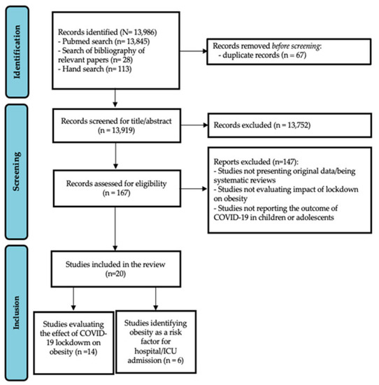Finally, 20 articles were considered eligible for full-text evaluation: 14 evaluated the effect of COVID-19 lockdown on obesity (first review aim), while six focused on obesity as a risk factor for hospital/Intensive Care Unit (ICU) admission (second review aim). The PRISMA flowchart, showing the study selection process, is reported in Figure 1.