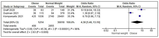 Due to the wide heterogeneity of outcomes, investigation tools and statistical analysis, only three studies could be included in the meta-analysis [36,37,38], showing a significantly increased risk of hospitalization for obese children/adolescents as compared to normal weight peers (OR = 4.38; 95% C.I. = 1.46–13.19; p = 0.009; I2 = 96%) (Figure 2).