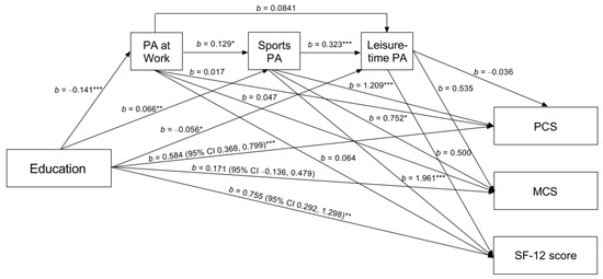Relationships between educational attainment and work, sport, and leisure-time physical activity in health-related quality of life (N = 364). We show unstandardized regression coefficients (b) and bootstrap confidence intervals for the association. PA is physical activity. PCS and MCS are physical and mental component summaries of SF-12. SF-12 score corresponds to the total score on the SF-12 scale. * p < 0.05, ** p ≤ 0.01, *** p < 0.001.