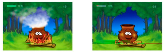 Below are two examples of games that children in Polish schools such as to play, along with their brief descriptions. The “clay pot” is a two-parameter game board, which in practice means that two rhythms, the desired and the undesired, are responsible for changing the image. The promoted rhythm is responsible for the amount of fire under the pot (the more, the better), which is the desired change, while the inhibited rhythm is responsible for the amount of steam coming out of the pot (the more, the better), which is also the desired change. If there is little fire and little steam under the pot, the direction of changes is undesirable.