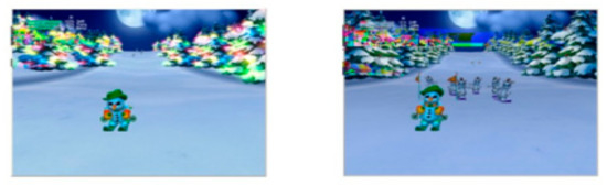 The action in this board focuses on the snowman’s escape from the evil snowmen; the greater the distance between the escapee and the pursuers, the better the promoted rhythm is responsible for this. The snowman should go as fast as possible—the inhibited rhythm is responsible for this (as in Figure 2). Additionally, on the board, Christmas trees should light up (the more, the better), for which the second inhibited rhythm is responsible. Moreover, the boards produce sounds. These changes are desirable. The undesired changes make the snowman move slowly, “bad” snowmen are close to him, and lights disappear from Christmas trees.