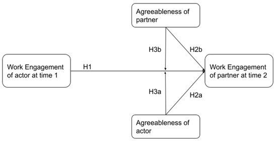 Agreeableness is also strongly related to empathy [56,69,70] which is a key ingredient for direct empathic reaction [3,36,71]. For example, Bakker and Demerouti [25], showed that perspective taking—the ability to understand or perceive a situation from the perspective of another person [72]—moderated the crossover process of work engagement between working couples. However, they also showed that empathic concern did not have such an effect. In a similar study, Bakker, Shimazu et al. [26] found that perspective taking moderated crossover of work engagement between Japanese couples, but only when women were the receivers of the information. Moreover, this study showed that engagement crossover was even more pronounced when both men and women were high in perspective taking, as it enabled individuals to better communicate their affective states and influence each other. Similarly, we would expect that agreeableness of both members of a work dyad would be instrumental in facilitating the crossover process.