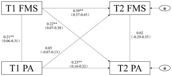 Cross-lag model of PA and FMS. ** denotes a statistically significant path coefficient p < 0.01.