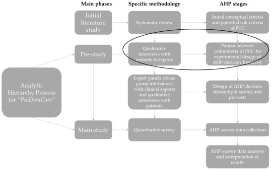 The overarching AHP-study, “PreDemCare” [33,34] adopts a sequential mixed-methods design for final instrument development [35], depicted in Figure 1. For the pre-study phase, we followed a qualitative design informed by a previous systematic review to identify relevant (sub)criteria, which would serve the development of an AHP. This report focuses exclusively on the pre-study phase of the overarching AHP study and describes the first qualitative component in detail.