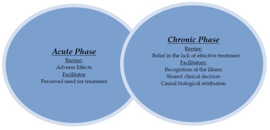 The recognition of the illness and the perceived need for treatment appears in this case as factors related to perceived facilitators. In relation to the first factor, in the “self-regulation model” carried out by Leventhal [48], there was the perception of illness with the dimensions of identity, control, and evolution over time, including consequences and causes. Later, other authors [49] indicated that this previous model may be applied in mental illnesses such as psychosis, eating disorders, depression, and BD. Thus, the dimension of control is related to the search for effective strategies, for example, medicine that heals or improves the prognosis. In relation to the causal dimension, the worries or vital stressing factors, such as the existence of an imbalance in the brain, are usually frequently identified as etiological factors of bipolar illness on the part of the patients [50].