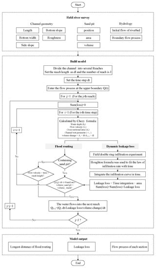 The dynamic leakage losses varies spatially and temporally during the water head advance. The characteristics of riverbed soil will affect the infiltration process; therefore, based on the field experiment, this study fitted the infiltration process using the Horton formula. Owing to the uneven distribution of riverbed lithology along the river, the infiltration process of each river section was explored. In the model, the process of water flow was calculated in turn by appropriately setting the time step, and the infiltration curve was integrated at each time step. This was coupled in the flood routing model in the form of leakage losses. The framework of the model is shown in Figure 1.