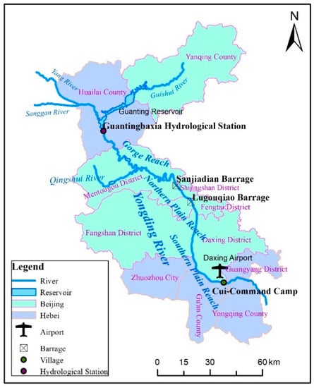The Yongding River originates from the southern edge of Inner Mongolia Plateau and the northern part of Shanxi Plateau and the terrain slopes from northwest to southeast. The Beijing section from Guanting reservoir to the Village of Cui-Command Camp was divided into the Guanting gorge reach (92 km), northern plain reach (37 km) and southern plain reach (64 km), as shown in Figure 2. This study focuses on the southern plain section, which extends from Lugouqiao Barrage to Cui-Command Camp, the water flow in this reach is relatively gentle, with a large amount of sediment deposited, forming a vast alluvial proluvial fan.