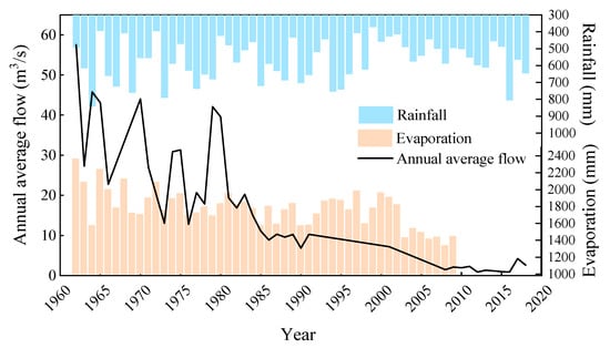Yongding River is the main river in Beijing. From 1962 to 2018, the average annual rainfall and evaporation [] of the river reach were relatively stable, and the rainfall was far less than the evaporation. The discharge of Guanting Reservoir in the upstream of the river decreased sharply, as shown in Figure 3, resulting in the cut off and drying up of Yongding River, as shown in Table 1. From 2019 to 2021, Yongding River realized short-term hydraulic connection through artificial water replenishment every year and shown ephemeral characteristics.