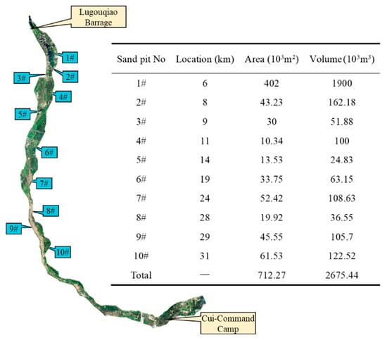 There were 10 large potholes in the southern plain reach, which were formed by manual excavation during the dry period of the riverbed. The total storage capacity of the 10 potholes is 25.02 × 106 m3, which has a substantial impact on the flow routing and cannot be ignored in simulation. The location, area and volume of each pothole are shown in Figure 4.