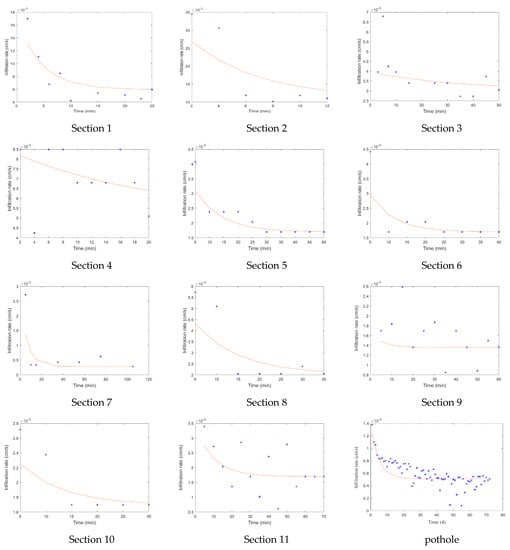 Fitted curve of the infiltration rate of 11 sections and pothole. The blue asterisk indicates the field measured infiltration rate, and the red line indicates the fitted riverbed infiltration process.