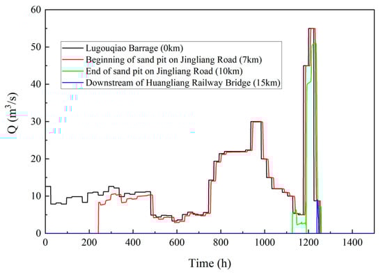 The results of the model were consistent with the actual flow process, as shown in Table 5. The discharge process of the Lugouqiao Barrage and the flow process in typical sections are shown in Figure 7. The relative error of this model in flow routing duration is 0.12%, and that in flow discharge is (Use Formula (10)). In general, the accuracy of the model is very high, which can provide scientific guidance for the upstream water release work.