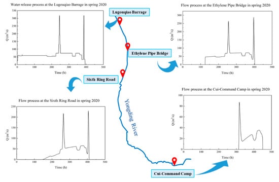 Flow process of typical sections in the southern plain reach of the Yongding River in spring 2020.