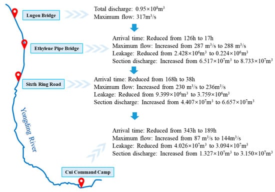 After the potholes were repaired, the water reached each section in a shorter time. According to the discharge process of the Lugouqiao Barrage in 2020, the time the water took to reach Cui-Command Camp was reduced from 343 to 189 h, and the whole water flow process advanced by 6.4 d. In addition, owing to the reduction of water storage in the potholes, the transmission flow of the river increased, which changed the hydraulic process of the river and reduced leakage. After the repair of the potholes, the total leakage from Lugouqiao to Cui-Command Camp reduced from 4.026 × 107 m3 to 3.094 × 107 m3, and the total water demand of the river reduced from 8.099 × 107 m3 to 3.951 × 107 m3.