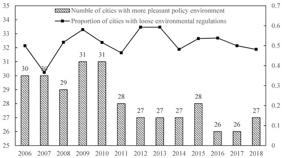 To further clarify the differences of in the policy environment among cities in Central China, we counted the number of cities whose policy environments are more pleasant than the average level of that year (Figure 4). The number of such cities which are defined as cities with more pleasant policy environment is decreasing, indicating that the gap of policy environment pleasantness between cities is becoming larger and the competition intensity in the policy environment between cities is increasing. According to related research studies, industries tend to agglomerate to big cities in Central China, resulting in wider development gaps between cities. When more industries agglomerate to large cities, small cities can no longer afford to provide high-quality public services and investments, thus reducing the number of cities with a more pleasant policy environment. In order to preliminarily explore whether these cities maintain their advantages over other cities through relaxing environmental regulation, we calculated the proportion of cities whose environmental regulations (Calculation method is the reciprocal of pollution emission per unit of GDP; the pollution emission indicators are consistent with Table 1) were lower than the average level of the year in this part of cities. It can be seen that, in most years, cities with relatively lower environmental regulation accounted for more than 50% of cities with a pleasant policy environment. Therefore, we can preliminarily conclude that, in order to maintain the attraction to industries, cities in Central China may create a pleasant policy environment by reducing environmental regulation, resulting in the problem of “regulation capture”, which will have an adverse impact on green growth. Standard econometric methods are adopted to confirm whether improving the pleasantness of the policy environment in Central China is really not conducive to green growth in the following.