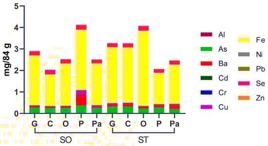 The acidity of the tomato sauce may explain the fact that ST samples had a higher barium content than the oil-conserved samples. Demont et al. (2012) [] reported a higher metal migration from a ceramic container surface with decreased pH for most metals, including barium. Barium accumulation can occur by ingesting contaminated food and water, and there is no evidence that barium is carcinogenic or mutagenic. However, animal studies report the occurrence of nephropathic, neurological, cardiovascular, and metabolic diseases. In humans, it appears to have the potential to cause hypertension [,]. Although there is no established UL for barium, there are limit values of tolerable daily intake determined by FAO/WHO at 0.02 mg/kg/day for drinking water. This amount is equivalent to 0.52 mg/day for a child of 26 kg, 1.2 mg/day for an adult of 62 kg, and 1.4 mg/day for adults weighing 70 kg []; therefore, for toddlers and children, barium concentration in samples is considerably high. Although barium is a component of food cans, most of our samples did not show worrying levels of barium as a metallic contaminant. Agencies such as EFSA set a limit of 1 mg/kg for the migration of compounds from packaging to food [], and thus only the ST-Pa sample exceeded this limit.