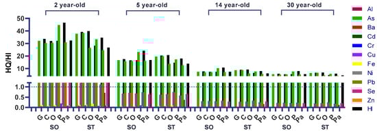 According to the non-carcinogenic risk index (HI) calculated by adding up the risk quotients for simultaneous exposure to metals, all SO and ST samples showed an HI value greater than 1 for all population groups studied.