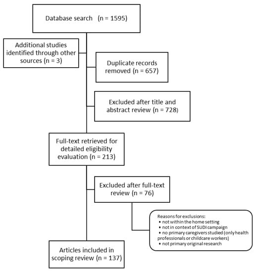 Literature that measured or focused on specific dimensions of infant safe sleep advice (e.g., implementation prevalence, awareness of current program messages) were included in the review. Peer-reviewed journal articles were included if they were published between the period of January 2000–May 2021. This timeframe was chosen as the incidence of sudden infant mortality largely began to plateau at the turn of the century among many western countries, with little change in rates since. While grey literature is often included in scoping reviews, due to the proliferation of safe sleep message evaluations from the caregiver perspectives since 2000, peer-reviewed literature was the focus for this review.