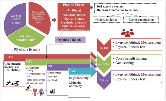 This study was based on the TPB and GST as frameworks for designing the intervention program (shown in Figure 1). Based on TPB, our study optimizes the content of physical fitness exercises in the physical education classroom, proposes a core strength training (CST) program to improve students’ motivation and fitness, and gives students quantitative goal-setting (GS) based on GST to motivate them to exercise. Four groups were included: (1) Experimental group 1 (GS), which performed a goal-setting intervention program; (2) experimental group 2 (CST), which performed a core-strength training intervention program; (3) experimental group 3, which underwent a combined program (GS + CST); and (4) the control group (CON), in which participants were asked to maintain their usual routines.