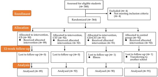Three hundred and sixty-eight students were chosen from eight classes in two middle schools in Hangzhou, Zhejiang Province, China, by random sampling, based on their voluntary participation in this study. The inclusion criteria required that (a) students were able to perform daily physical education classes, and (b) students did not participate in the school’s after-school sports club. Four students were excluded because they participated in daily training with the school’s soccer club. Of the 368 candidates, 364 volunteers met the inclusion criteria, as described in Figure 3. Before the study, the demographic information of these students was collected, then we allocated them to the intervention (GS, CST, GS + CST) and control groups. A total of 364 students were pretested at baseline, and two students (one in the GS + CST group due to a sprained ankle; one in the control group due to transfer to another school) were lost to follow-up at the posttest. All the participants completed the psychological questionnaire.