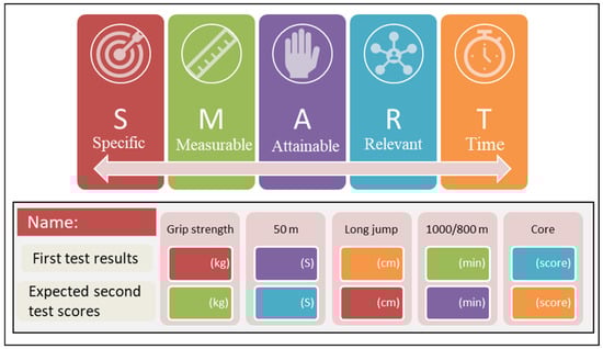 Goal setting (GS) is a conscious and effective way to motivate individuals to be physically active and is an important factor in successful behavior change. Planning is ineffective without goals both short and long term. Goal-setting theory (GST), proposed by Locke [27,28], argues that effective goals require five principles: Goals must be clear, challenging, complex, and committed to and must also allow for feedback. Studies have confirmed the effectiveness of GS for interventions related to students’ physical activity behaviors, such as works by Spruijt-Metz (2008) and Weaver (2017), who stated that teaching students GS physical education lessons could be an effective strategy for promoting regular physical activity and increasing aerobic fitness [29,30]; Wilson (2017) used GS for children’s physical activity and enjoyment [31], and McDonald (2015) intervened with students by arranging for them to receive a SMART GS curriculum [32], both of which showed some intervention effects. Additionally, Japanese interventions for promoting students’ physical strength attached great importance to GS, not only as the intended purpose of the activity to achieve direction, motivation, and cohesion but also as a criterion for decision-making and a basis for assessment. The contribution of GST applied to interventions is that by quantifying it, exercise for students has a target reference and can serve as a form of motivation, but its disadvantage is that it is not easy to judge the rationalization of individual GS in different contexts. The SMART principle of GS is one of the ways to set goals effectively and was first proposed by management guru Peter Drucker in his book The Practice of Management. The SMART principle consists of five components of effective goals: They must be specific, measurable, attainable, relevant, and timely [33]. S stands for specific, which means that the goal setting or performance evaluation criteria must be specific so that people know what to do. M stands for measurable, which means that the goal or target should be measurable and able to give clear judgment, such as through data. A stands for attainable, which means that when setting goals for yourself or others, the goals should not be too high or too low; if they are too high, it is easy to discourage people; if they are too low and unchallenging, there is no need to work hard to reach them. R stands for relevant, which means that there should be some relevance between the goal and the target, regarding the overall goal or direction. T represents the time bounds, that is, the deadline for a goal; if there is no deadline, then it is essentially invalid, which is the biggest enemy of procrastination.