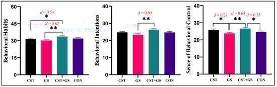 Variables with significant differences were compared with Bonferroni post-hoc to further understand the differences between the four groups. For behavioral habits, the CST + GS was higher than the CST by 2.14 points (95%CI: 0.04–4.24, p < 0.05, Cohen’s d = 0.54) and higher than the GS group by 3.47 points (95%CI: 01.40–5.55, p < 0.05, Cohen’s d = 0.62). For behavioral intention: scores were 2.93 higher in the CST + GS group than in the GS (95%CI: 1.11–4.75, p < 0.05, Cohen’s d = 0.69). For sense of behavioral control, the CST + GS group was higher than the GS group by 2.8 points (95%CI: 1.0–4.6, p < 0.05, Cohen’s d = 0.63) and higher than the control group by 2.07 points (95%CI: 0.29–3.84, p < 0.05, Cohen’s d = 0.35); the CST group was higher than the GS group by 2.0 points (95%CI: 0.21–3.78, p < 0.05, Cohen’s d = 0.27). Figure 6 shows the results of the post-hoc test between GS, CST, GS + CST, and CON.