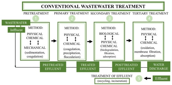 Conventional wastewater treatments include a combination of the abovementioned processes, which are divided into preliminary, primary, secondary and tertiary wastewater treatments (Figure 1) [39]. Among these, preliminary treatment is designed to remove solids and large materials from raw wastewater. The primary treatment is sedimentation, which is the physical process that permits particles in wastewater effluent to deposit the suspension under the influence of gravity and thus become a sludge. The secondary step is anaerobic digestion, which is a biological treatment where the organic pollutants in the sludge are transformed by anaerobic microorganisms into gaseous products, such as methane. The final step is tertiary treatment, which is a chemical treatment that removes the organic load and effluent from the secondary treatment plants which contain nutrients, mainly phosphorus and nitrogen [132,133].