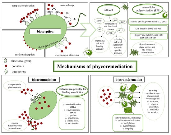Both macroalgae and microalgae are photosynthetic organisms that need abundant mineral nutrients, such as sodium, potassium, magnesium and calcium, as well as trace elements and carbon dioxide [173]. Thus, such algae are excellent for treating nutrient-rich municipal wastewater and sewage from the food industry (oil mills, wineries or breweries) [174,175]. Furthermore, the usefulness of algae in removing metals from the environment has been extensively discussed [176,177] and relates to the presence of internal and extracellular detoxification mechanisms in algal cells. One of the key elements of the reaction of microalgae with heavy metals is changing the expression of genes encoding selected proteins, and transporters responsible for processes such as the uptake, sequestration and detoxification of heavy metals [176,178]. Although the phycoremediation of nutrients and heavy metals is most often described in the literature, the use of this method to remove other pollutants, such as pesticides, dyes and pharmaceuticals, is reported in numerous papers. Despite anthropogenic contaminants varying in their chemical structures and physico-chemical properties, some of the mechanisms involved in phycoremediation appear to be unspecific and valid for substances of different types.