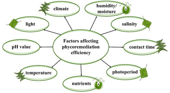 The effectiveness of phycoremediation is influenced by many factors, including the algae species used in the process, characteristics of the toxicant being removed, temperature, pH, availability of light, oxygen, nutrients, humidity/moisture, climate and salinity (Figure 3). Thus, each of the parameters needing to be applied in a particular phytoremediation system requires optimizations of intensity and value; this is one of the probable reasons why the literature still lacks comprehensive data on the influence of individual factors on the ability of selected strains to remediate pharmaceutical contaminants. Therefore, different factors such as light, pH value and temperature should be considered when planning algae systems to remove contaminants.