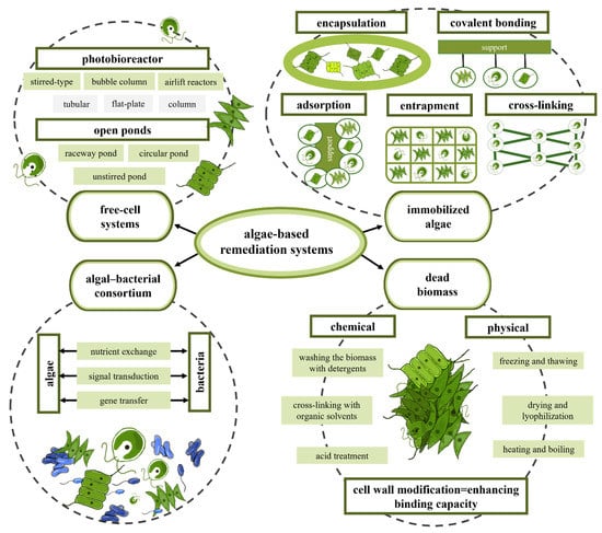 There are many variants to the different open and closed algal-based systems for wastewater treatment described above, including variants where free cells, immobilized algae, algal-bacterial symbiotic consortia or dead biomass as a biosorbent are used (Figure 4).