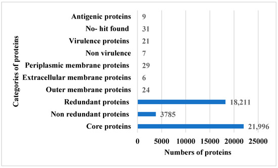 In this research study, total of six fully sequenced proteomes, namely (i) ASM80740v4, (ii) ASM81422v1, (iii) ASM396479v2, (iv) ASM399975v1, (v) ASM1493169v1 and (vi) ASM172978v1, were retrieved from the NCBI database. In the retrieval phase, several filters were applied (e.g., fully sequenced proteomes), humans were considered as hosts and incomplete proteomes were discarded. The BPGA pipeline was then utilized to extract core proteomes from pathogen complete proteomes. The BPGA results revealed that the pathogen consists of 21,996 core proteins, while the CD-HIT analysis revealed that the pathogen core proteins contain 3785 non-redundant proteins and 18,211 redundant proteins. The core proteins are regarded as good vaccine targets due to their major role in bacterial essential pathways and functionality [61]. The non-redundant proteins are duplicate copies of the pathogen genes and are considered bad vaccine candidates [62]. Subcellular localization analysis revealed that the 18,211 redundant proteins contain 24 outer membrane proteins, 6 extracellular membrane proteins and 29 periplasmic membrane proteins. The surface proteins are in direct contact with the host cells and have immune-dominant epitopes for activation of immune pathways; thus, they are good vaccine targets [63]. The VFDB analysis determined 7 as non-virulent while 21 were predicted as virulent and considered for further analysis. Virulent proteins activate strong infection and immunological pathways and therefore are attractive vaccine targets [23]. Antigenicity analysis predicted nine proteins as probable antigenic proteins. The number of proteins determined in each step of proteome subtraction is shown in Figure 2, while the size of the genome of each strain is shown in Figure 3.