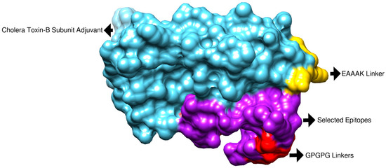 In multi-epitope designing and processing, a multi-epitope vaccine was constructed and then processed [37,38]. In the construction phase, the filtered epitopes were linked through “GPGPG” linkers and linked with “cholera toxin B-subunit adjuvant (CTBS)” via an EAAK linker [20,39,40]. The linkers used prevent epitopes from folding over one another and keep the epitopes separated so they can be easily presented to the host immune system [35]. After the construction of the vaccine construct, the physicochemical properties were analyzed for the designed vaccine construct using Protparam [41].