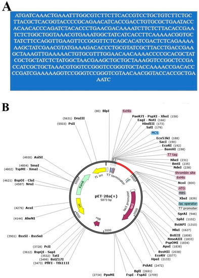 Codon optimization and cloning analysis of vaccine. (A) DNA sequence of the vaccine (B) In silico cloned pET28a (+) vector.
