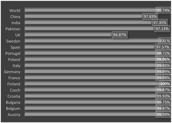 In population coverage analysis, the vaccine construct was checked for world and country-wise coverage. According to IEDB population coverage, the designed vaccine construct molecule was able to cover a worldwide population of 99.74%, while the highest countrywide populations are in China (97.83%), India (97.35%) and Pakistan (97.13%). The vaccine construct has the ability to provide immunity against the pathogen in 100% of the population of Sweden, as shown in Figure 11. For more data, please refer to Table S5.