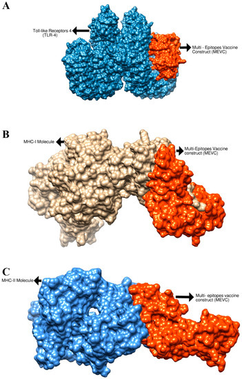 Structure of the vaccine docked to the TLR-4 molecule (A), MHC-I molecule (B) and MHC-II molecule (C). The receptors are represented by colored surfaces while the vaccine is represented by an orange surface.