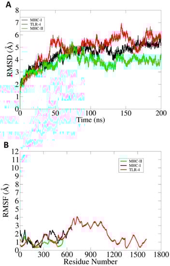 MDS analysis is an in silico approach for evaluating the dynamic behavior of docked molecules. The simulation analysis consists of (i) root mean square deviation (RMSD) [68] and (ii) root mean square fluctuation (RMSF) [69]. The RMSD allows the superimposition of all simulation snapshots based on carbon alpha atoms. The deviation was measured in the term of angstroms and schemed as shown in Figure 13A. The complexes were found to have good stability, and the RMSD was found to be within 7 Å. The vaccine–MHC-II complex was highly stable with very minor fluctuations. The RMSD of the vaccine–MHC-I was seen to exhibit an increasing trend, but in the end, the graph became stable and no drastic changes were observed further. Throughout the length of simulation time, minor structure variations can be noticed, which is understandable considering the large interacting surface area of the molecules and the high percentage of loops in the receptors. However, it was noticed the intermolecular interactions are strong enough to keep the binding mode stable. Next, the docked complexes were analyzed on the residue level of fluctuations via the RMSF. In RMSF analysis, very low-level fluctuations were observed throughout the simulation time for each docked complex. Little fluctuations might be due to vaccine adjustment at the docked site. However, these fluctuations did not affect the overall stability and binding mode of the vaccine to receptors as shown in Figure 13B. The results of the simulation were further validated through binding free energy calculations. This was achieved through MM-PBSA and MM-GBSA analysis. The MM-GBSA findings revealed the net delta energies of −225.97 kcal/mol for the vaccine–TLR-4 complex, −181.99 kcal/mol for the vaccine–MHC-I complex and 177.52 kcal/mol for the vaccine–MHC-II complex. Moreover, in MM-PBSA analysis, net energies of −231.98 kcal/mol for vaccine–TLR-4 complex, −189.9 kcal/mol for vaccine–MHC-I complex and −177.43 kcal/mol for vaccine–MHC-II complex were estimated, as mentioned in Table 4. Generally, the free binding energy estimations reported the good overall stability of the systems.