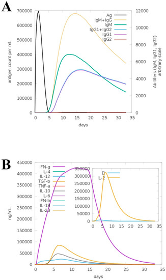 The “C-IMMSIM” server was utilized to check the immunogenic profile of the model vaccine for a period of about 35 days. The server predicted primary as well as secondary immune responses to the vaccine in the form of different types of antibodies. Additionally, the combination of IgM and IgG was also seen in the higher titers, followed by “IgG1 + IgG2” and IgM, as shown in Figure 14A. Different types of cytokines and interleukins were also observed in response to the vaccine, as shown in Figure 14B. Among them, IFN-g, TGF-a, IL-6 and IL-4 are the most promising responses against the vaccine. The elevated antibody rate and different types of cytokines demonstrated that the vaccine molecules can properly induce host immune responses. It further implies that both humoral immunity and cell-mediated immunity are key in the clearance of the antigen.