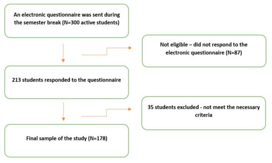 A preliminary electronic questionnaire (Supplementary File S1) was completed by 213 students. After the beginning of the new semester, the participants were appointed for further examination. The moment was chosen since it was far from any seasonal holidays and stressful periods due to exams. The inclusion criteria for participating in the study were willing to participate in the study and the absence of systematic diseases. The exclusion criteria were an unwillingness to participate in the study, presence of some severe chronic illness, cognitive disability and active inflammation, history or presence of severe neuromuscular illness, ongoing medication with antipsychotic, antidepressant drugs, hormonal therapy, and contraceptive pills, more than two missing teeth per quadrant (excluding third molars), ongoing prosthodontic or orthodontic treatment. After excluding those who did not meet the necessary criteria, the final number of respondents was 178 (Figure 1). The Raosoft, Inc. survey software (Seattle, WA, USA; http://www.raosoft.com, accessed on 21 July 2021) was used for the sample size calculation. Power analysis revealed that the study required at least 169 participants, with the margin of error set at 5% with 95% confidence intervals. The study was conducted in complete accordance with the World Medical Association’s Declaration of Helsinki. The subjects were fully informed about the study and gave written consent to participate voluntarily. The investigation was approved by the Ethics Commission of the Faculty of Dentistry in Pancevo (Approval Protocol No. 689/2-2021, according to Resolution sections 3, 7, and 8 of the National Commission of Ethics in Research).