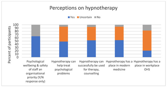 One hundred percent of participants agreed that employee anxiety impacts productivity in the workplace. A share of 65% indicated that employee psychological well-being and safety was a priority for their organisation (Figure 2). Approximately half of the respondents believed that hypnotherapy was a useful modality to manage psychological well-being and had a place in modern medicine; however, more than 40% were uncertain.