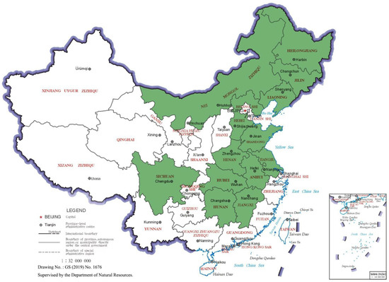 The research methods of Xu and Mu [53] and Cao et al. [54] were used to calculate the water footprint of grain production in this paper. The crop growth data and meteorological data were derived from the “study on the water demand contour map of China’s major crops (books)”, “Cropwat Software”, the database of The United Nations Food and Agriculture Organization, the China Meteorological Data Network (http://data.cma.cn, (accessed on 15 October 2021)), provincial statistical yearbooks, and previous research [52,55]. The calculation of carbon emissions from grain production adopted the coefficients and methods used by Cheng et al. [56] and Li Bo et al. [57], and the basic data of carbon sources were collected from provincial statistical yearbooks. In addition to the calculation of crops’ water footprint and carbon emissions, the remaining data indicators and variables were derived from provincial statistical yearbooks, the National Bureau of Statistics database (https://data.stats.gov.cn, (accessed on 8 January 2022)), and the “China rural statistical yearbook” from 2001 to 2020.