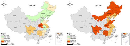 Comparison of the comprehensive technical efficiency of grain production resource allocation in the major grain-producing areas in China in 2000 and 2019 after adjustment.